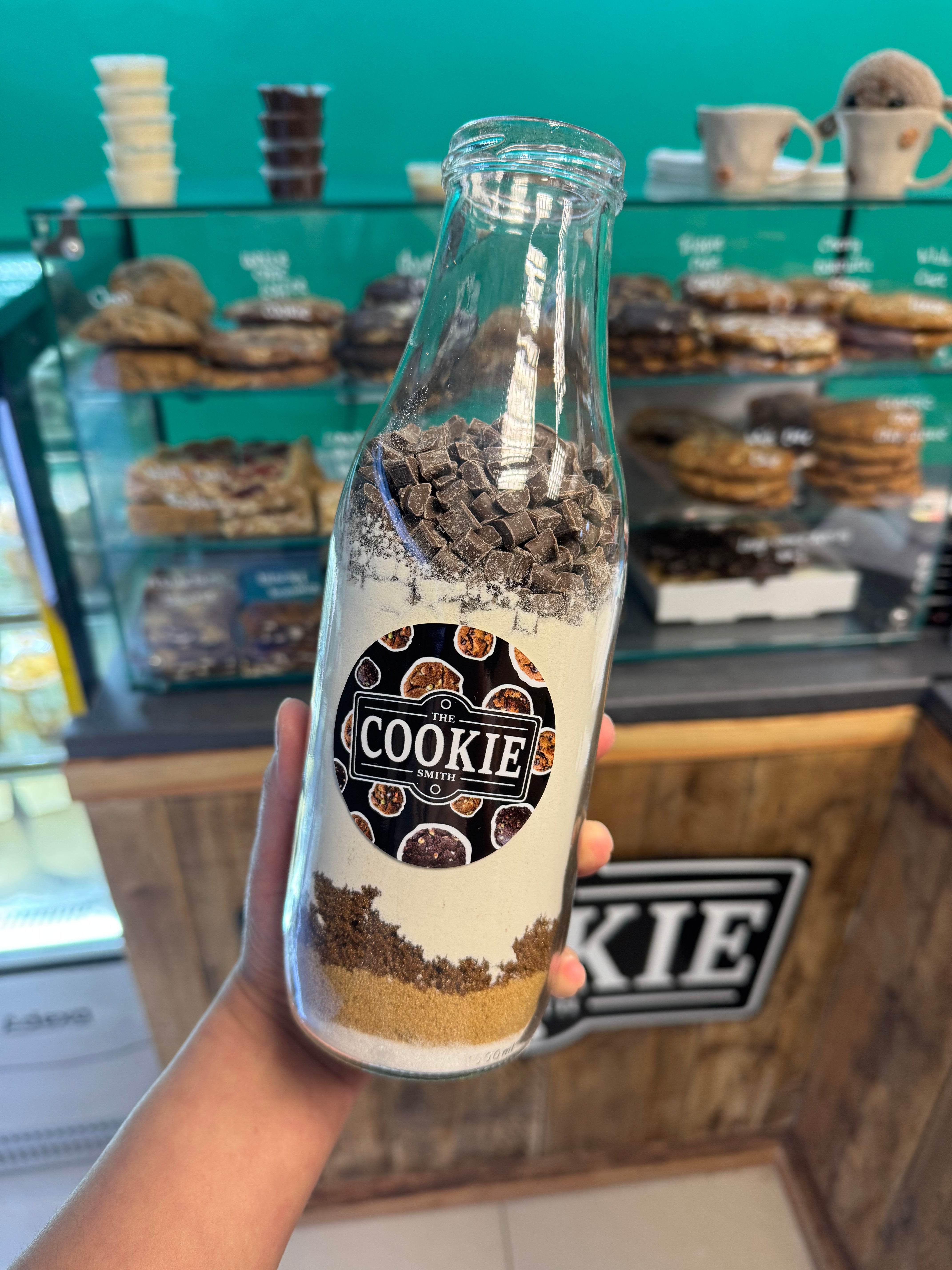 These bake bottles come with an instruction card and all the dry ingredients you need to make 4 of our signature sized cookies (or 8 smaller ones) at home.
